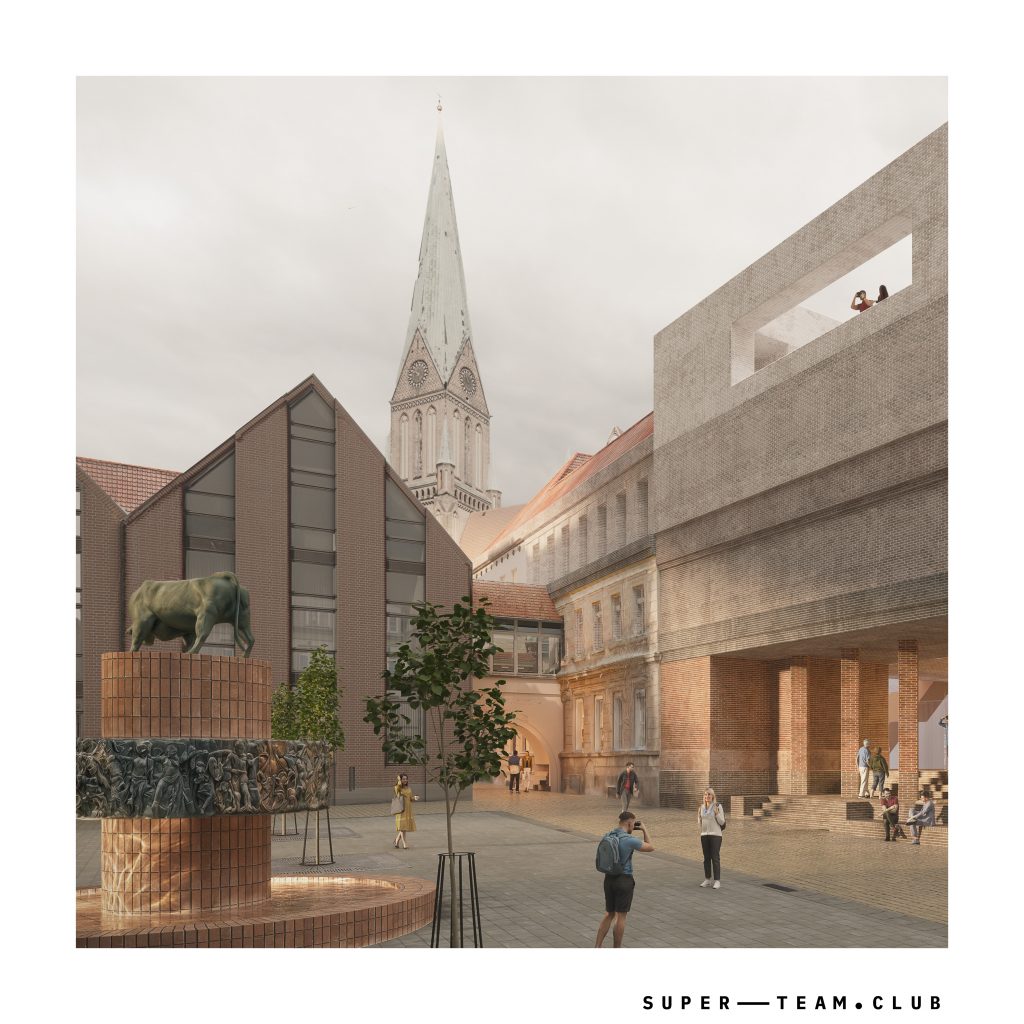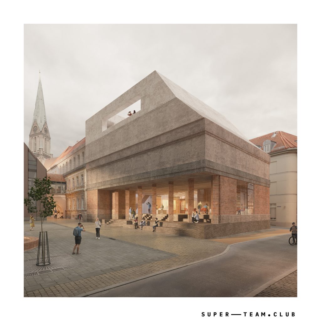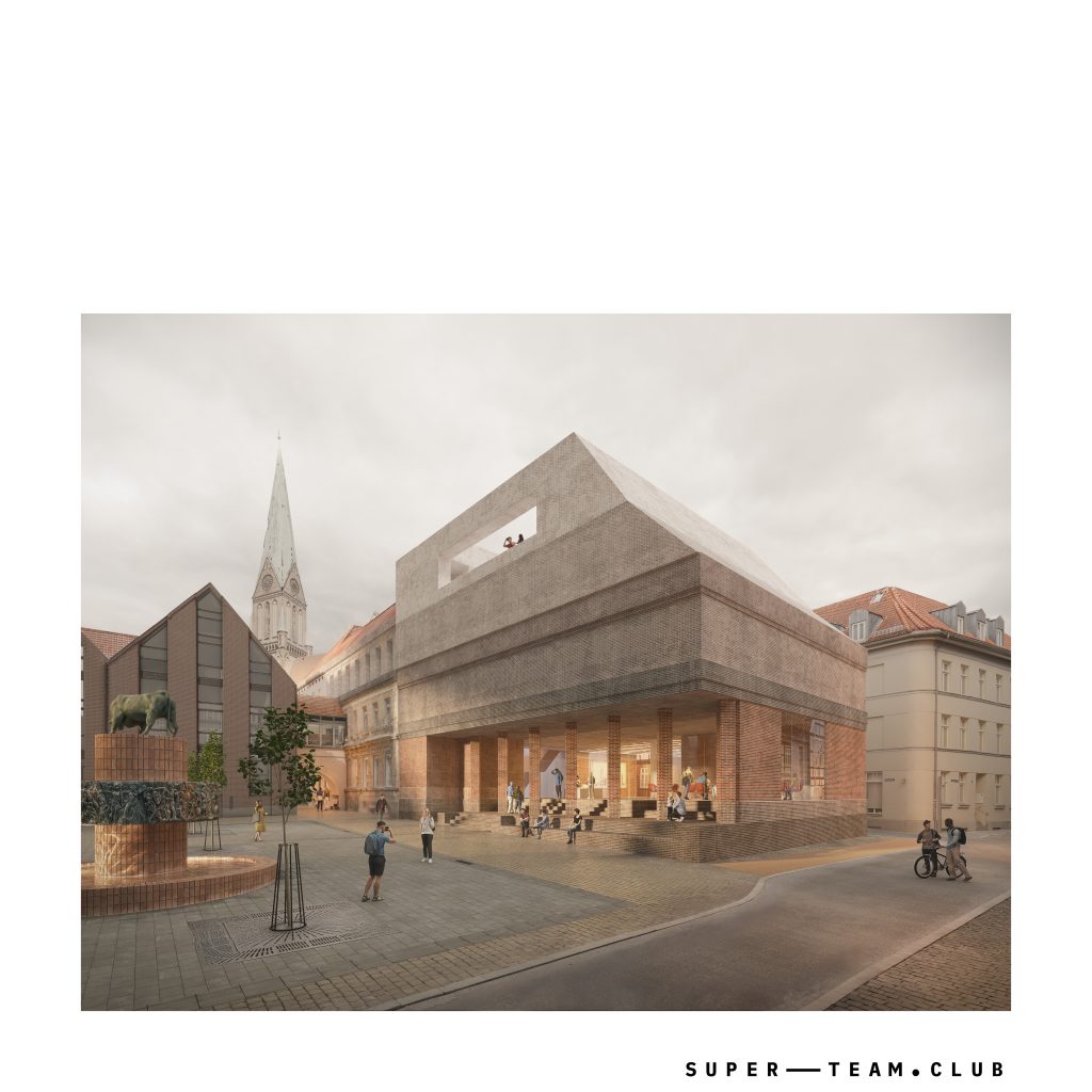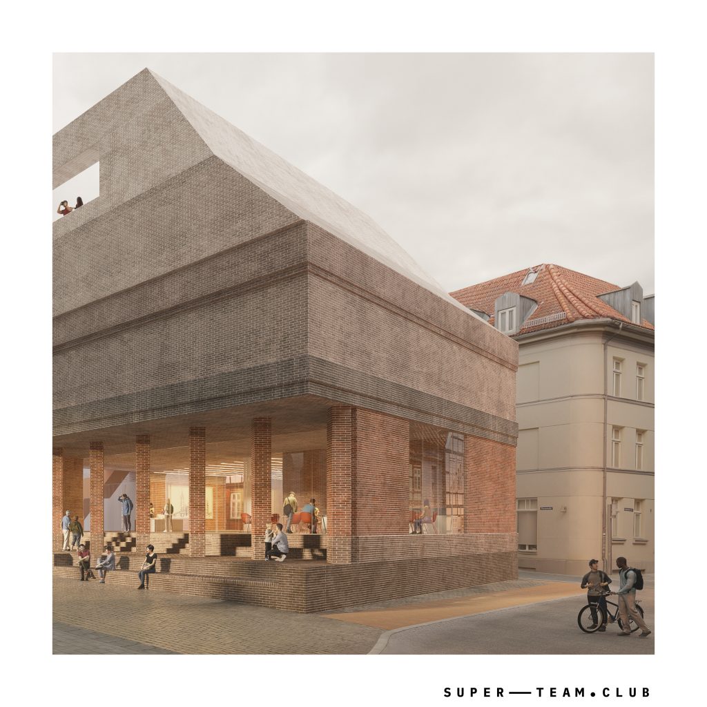 Klassizistische Elemente wie Sockel und Säulen werden zeitgemäß transformiert, der Sockel durch Sitzstufen geöffnet. Die Stadtveranda als „dritter Raum“ schafft einen öffentlichen Begegnungsort. Die Backsteinfassade nimmt die Farbigkeit der Umgebung auf und schafft durch Öffnungen neue Blickbeziehungen. Der Bau vermittelt zwischen Alt und Neu sowie Stadt und Museum.
